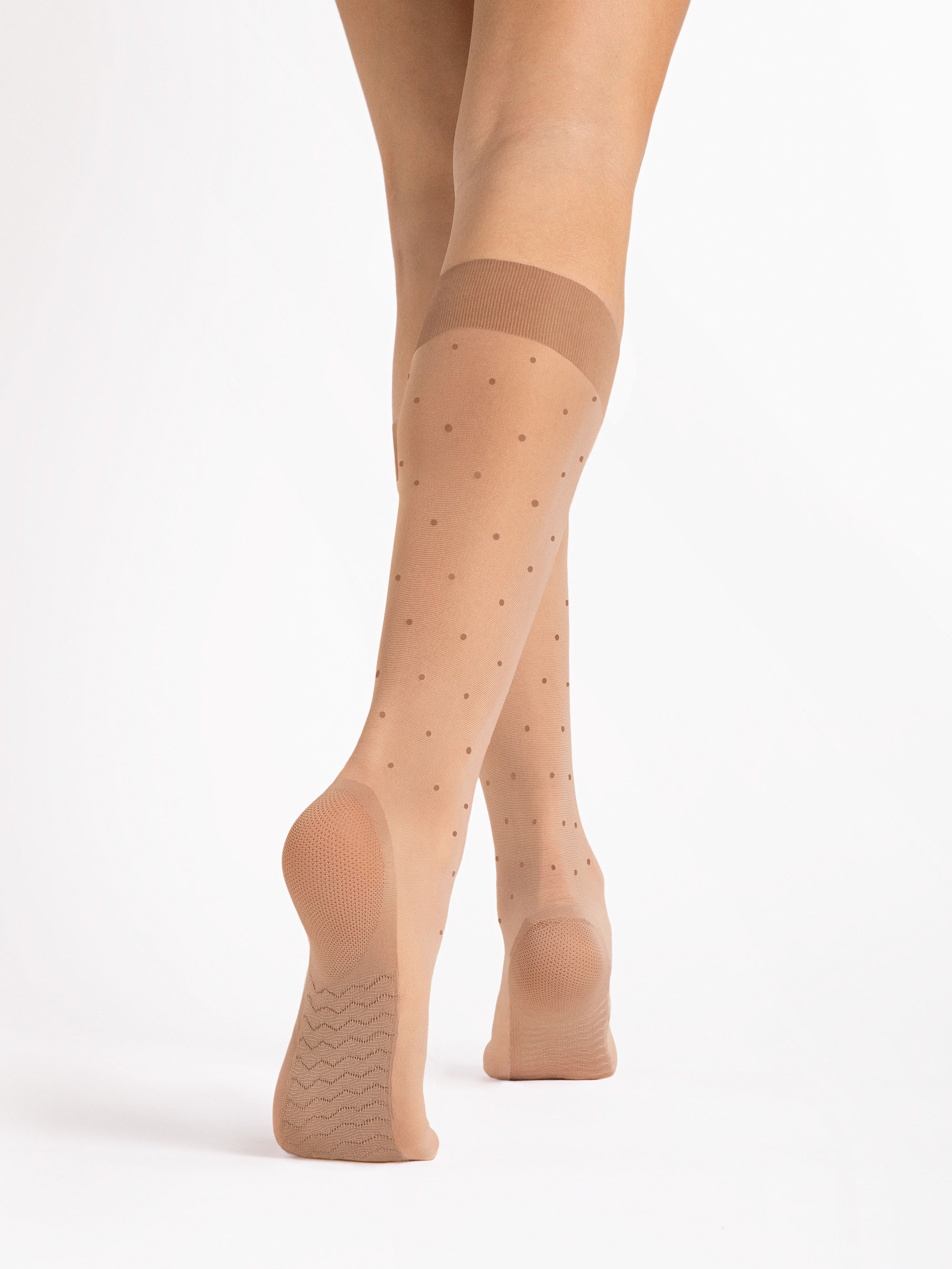 20 denier polka dot knee highs with a prophylactic foot-massage effect and a non-pressure band.