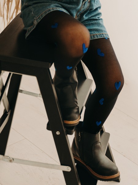 Children's tights are made with the utmost care, are perfectly fitted and at the same time flexible, providing active children with long hours of unrestricted movement. The vibrant blue shade of the hearts contrasts beautifully with the deep black background, creating a captivating visual effect.
