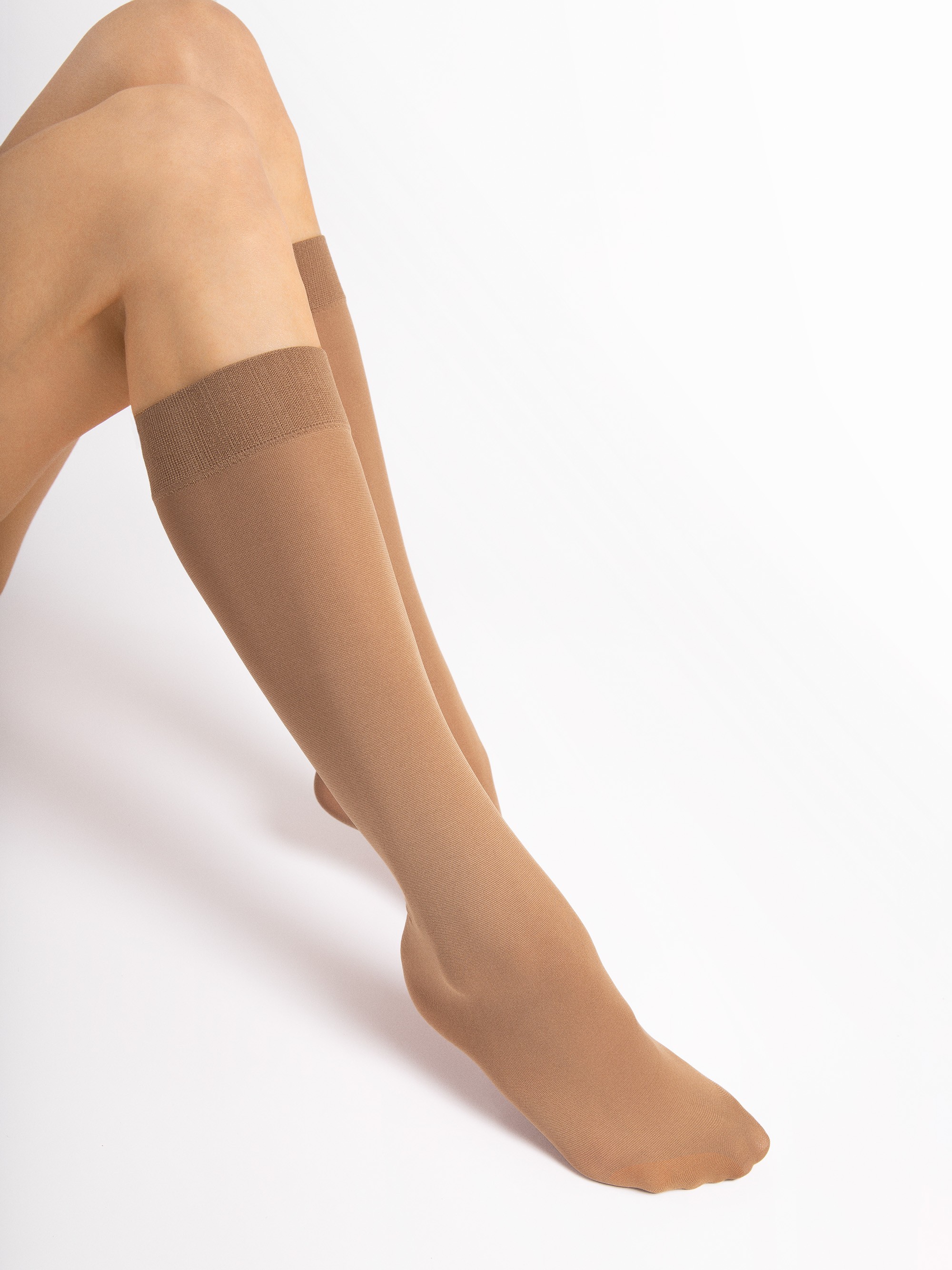 Top quality, opaque microfibre knee highs with comfortable non-pressure band and invisibly reinforced toe portion. Available in various colors.