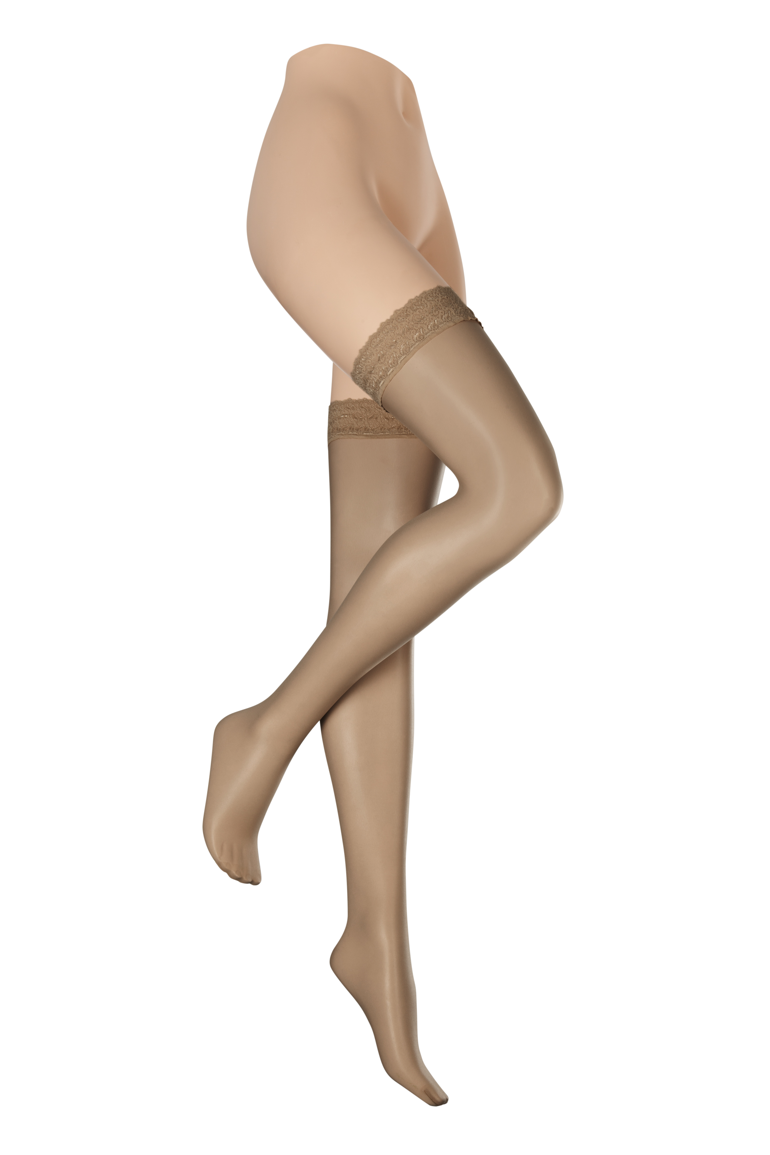 Ultra sheer matt summer stay ups - The perfect nude look for your legs. Fashionable lace band with double silicone strips, sandal toe. 14 denier