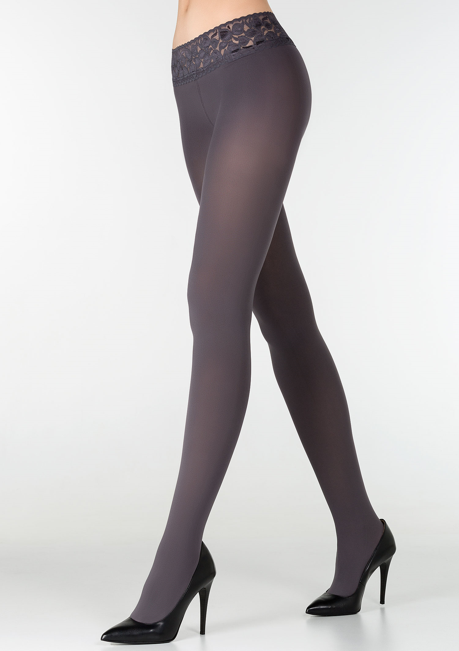 Opaque hipster tights with waistband adorned with elegant lace with silicone strips for a perfect grip.